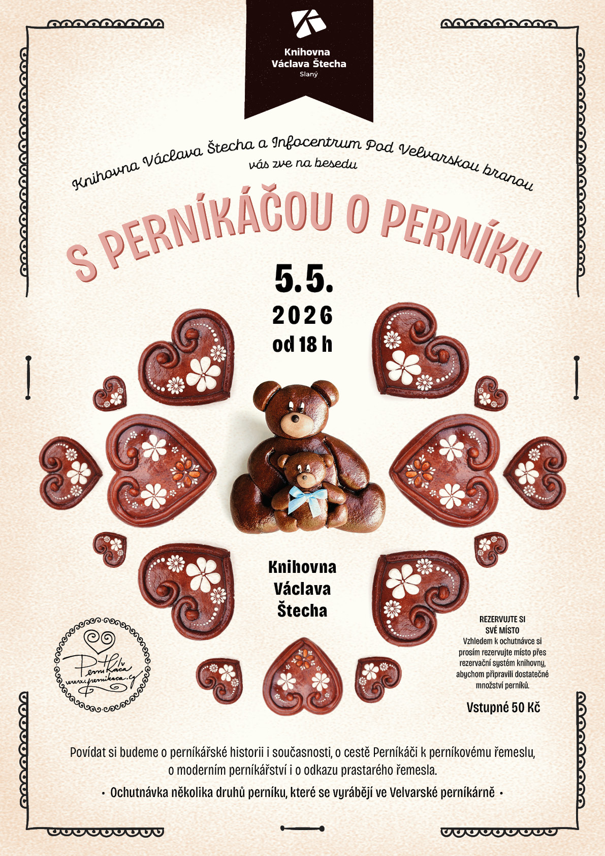 Zveme vás na neformální besedu s Kateřinou Wolákovou, známou jako PerníKáča, která nám poodhalí tajemství tradičního perníkářského řemesla. PerníKáča se specializuje na tradiční i moderní zdobení perníků a její besedy bývají spojeny s ukázkami řemesla i vyprávěním o historii této sladké tradice. A jak se z koníčku stala vášeň a uznávaná značka.